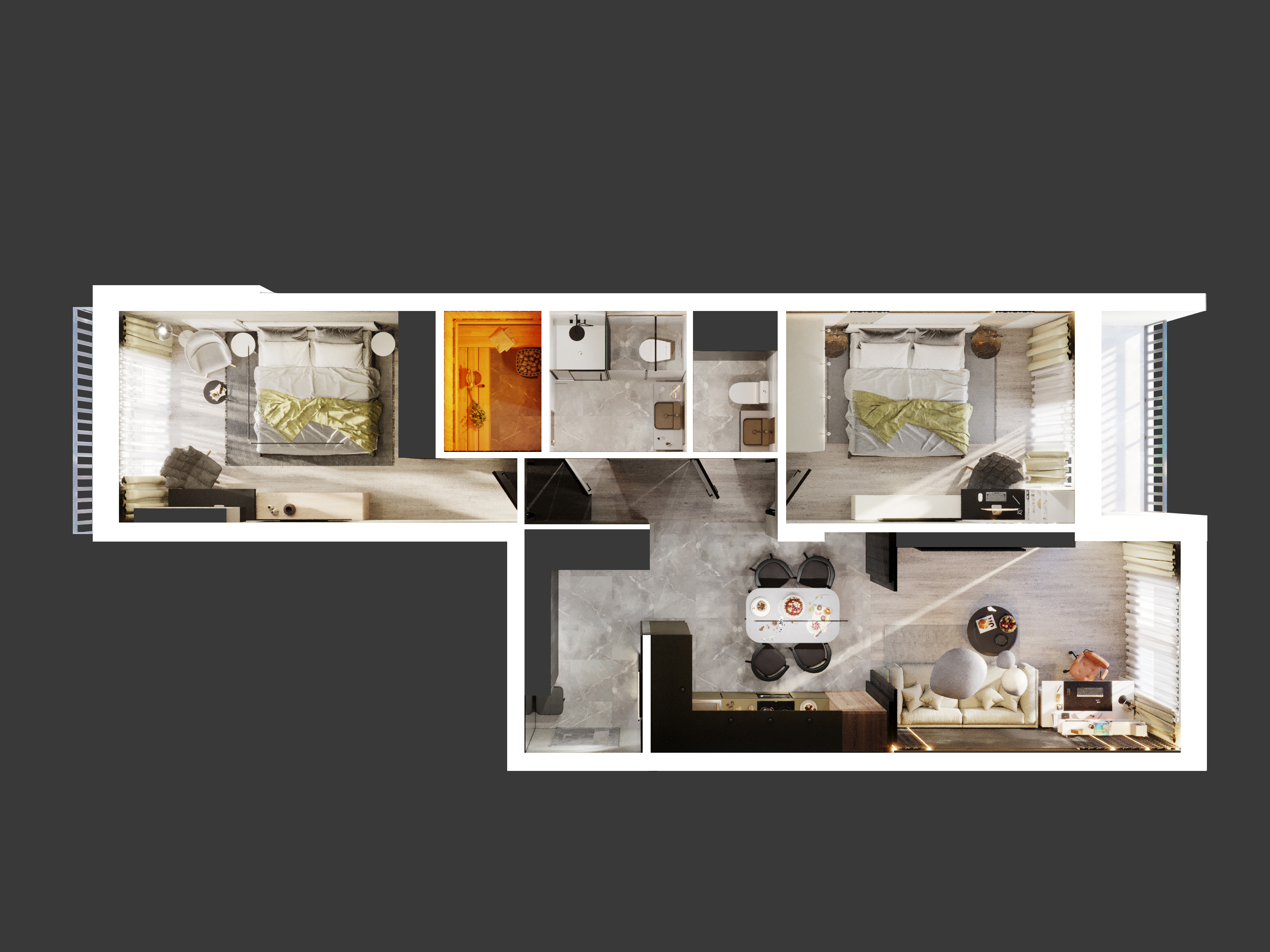 - Собственная терраса и сауна в каждой квартире;